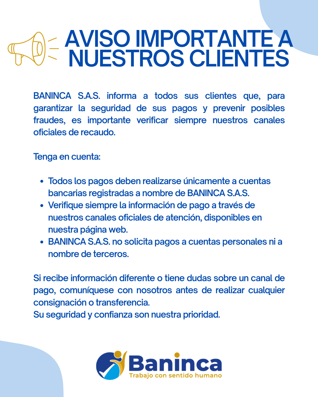 En cumplimiento de la Ley 2300, promulgada el 10 de octubre de 2023, queremos informar que en BANINCA estamos firmemente comprometidos con su implementación y